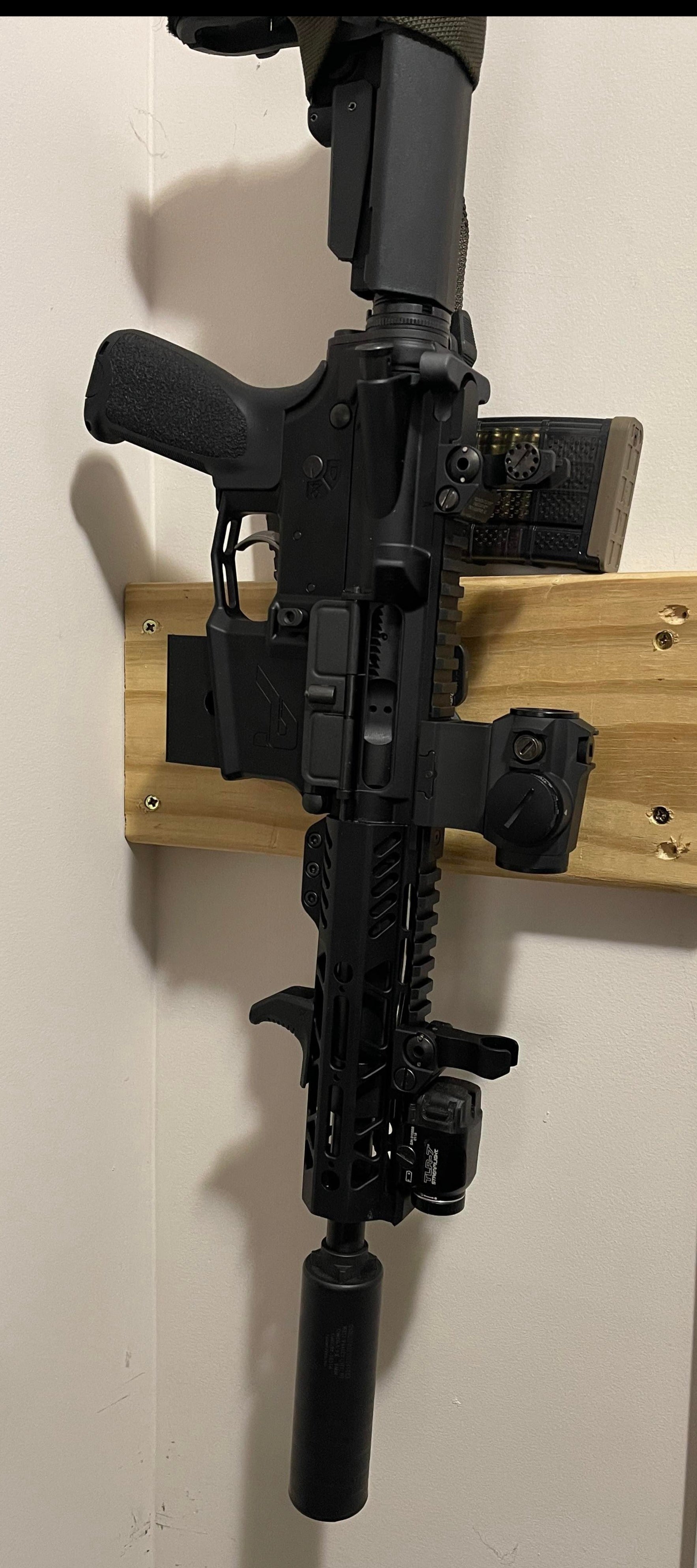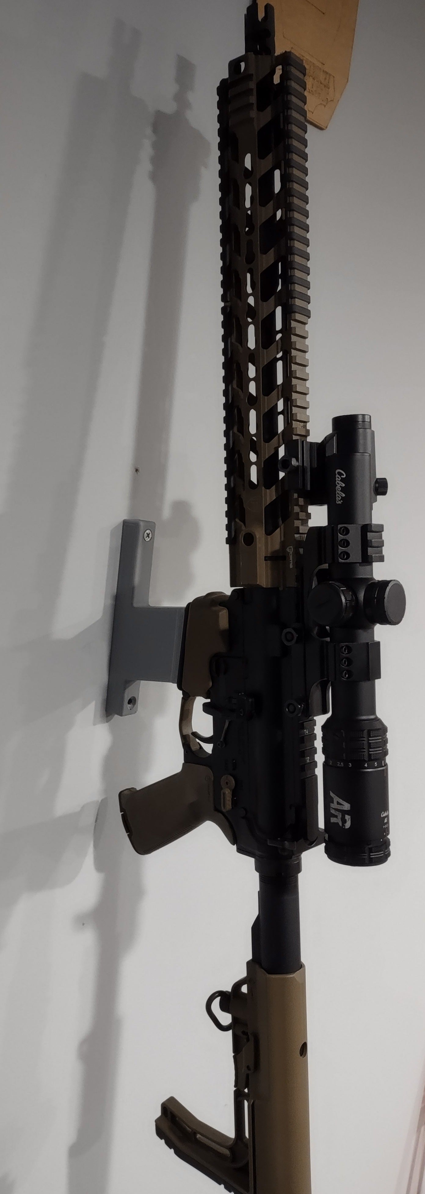 Ar-15 Wall mount, designed to work with most mil-spec ar-15 lowers. The mount is designed to be secured via the magazine release, in order to take the gun off the mount it is necessary to push the mag release while pulling the weapon off the mount. Mount will work with the muzzle up or down. A horizontal Mount can also be mounted to store the weapon with the muzzle up or down.