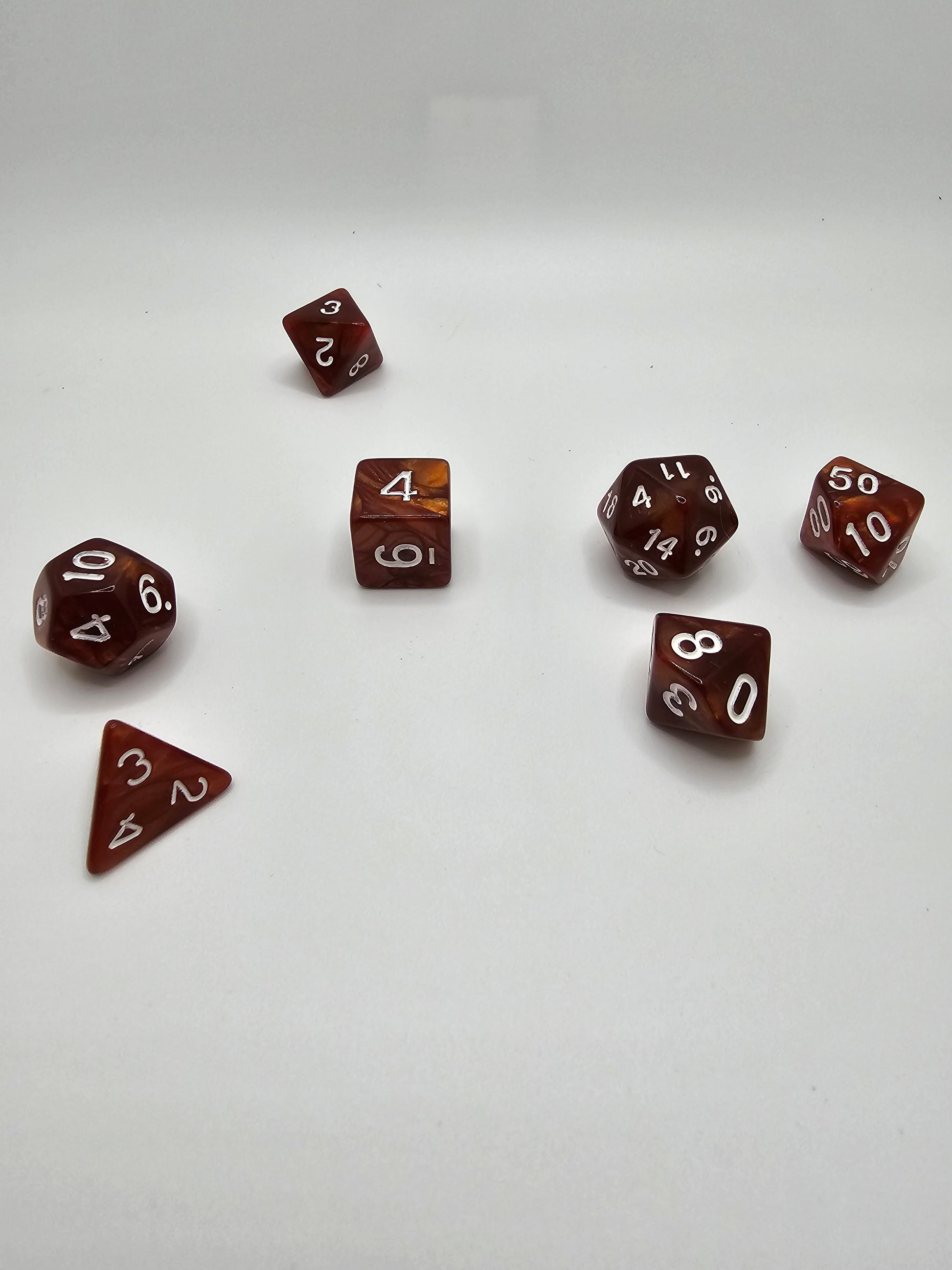 Each 7-die set contains 1 D20, 1 D12, 2 D10 (00-90 and 0-9), 1 D8, 1 D6, and 1 D4